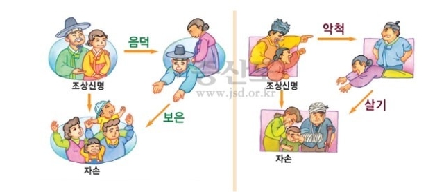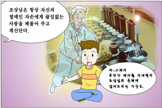 조상과 자손을 한 그루의 나무에 비유하면 조상님은 뿌리, 자손은 열매라고 할 수 있습니다. 자손들은 뿌리인 조상 기운으로 살고, 내가 조상을 잘 섬기면 뿌리의 힘이 강해져 자손이 튼튼한 열매를 맺게 됩니다. 내가 잘되고 성공하기 위해서는 하느님과 조상님을 일체로 받들어야 하는 것입니다.