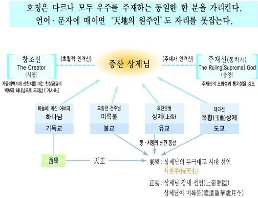 삼신 상제님, 옥황상제님, 황천상제님, 호천상제님, 하느님, 하나님, 천주님, 미륵부처님, 도솔천주님 등등.