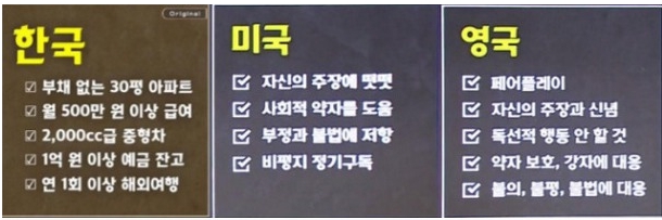 또다른 예로 중산층의 기준을 보면 한국은 물질적 가치를 중시하고 반면에 외국은 정신적 가치를 중시한다.