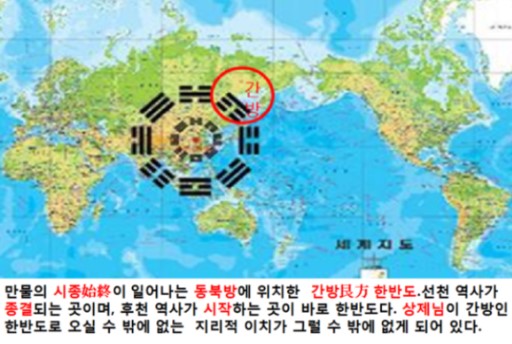 - 지구의 주축: 전 세계적인 파멸의 시기에도 한반도가 가장 적은 피해를 입는 이유는 한반도가 지구의 주축(간방, 艮方)에 위치해 있기 때문이라고 설명했습니다.
