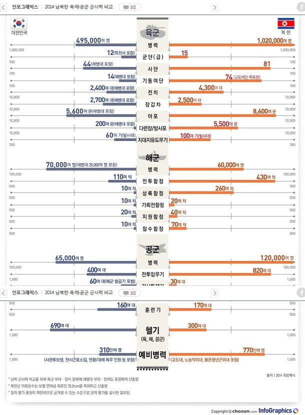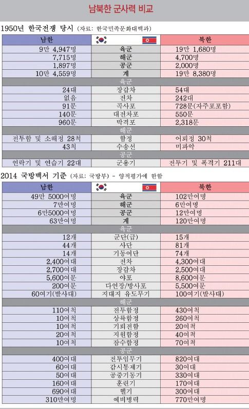 국방부는 2015년 1월 6일에 발간한 <2014 국방백서>에서 북한의 핵무기 소형화 능력이 상당한 수준에 도달했고, 탄도미사일 탑재가 가능한 신형 잠수함을 개발하고 있는 징후도 포착된 것으로 공식 확인됐다. <2014 국방백서>를 통해 남북한 군사력 현황을 알아보았다.
