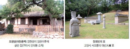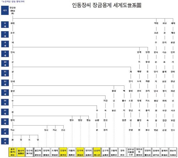 장금용 장금용을 시조로 삼는 문헌적 근거는 조선 선조 때 여헌旅軒 장현광張顯光이 기술한 「여헌록旅軒錄」이다. 여헌이 “인동 장씨의 시조는 대광공 장금용(所及知最先之祖大匡公)”이라 하고 “대광공의 부와 조부가 누구인지, 그 이상의 조상이 있었는지 세계가 전해오지 않아 알 수 없다(其上所未及知考又幾許代乎)”라고 하였다. 장금용은 고려 때 개국공신 삼중대광三重大匡(정일품의 품계)에 올라 신호위神號衛(국방을 맡은 대위중의 하나) 상장군上將軍(정삼품의 무관직으로 각 군영의 수직)을 역임했다. 전체 25개 파가 있는데 인동 향내 지명을 파명派名으로 하는 5개 파와 타 지역 명을 파명으로 20개 파로 나뉜다. 조선시대에는 정승 1명, 왕비 1명, 문과급제자 55명을 배출하였다. 14세손 장보張俌의 자손들까지는 인동·성주 등지에 살다가 18세 이후로는 예산·진주·하동·원주·상주·무안·은진·공주·서천 등지로 흩어졌다.