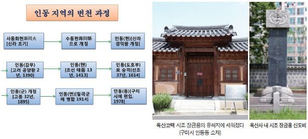 인동仁同은 본래 신라 때 사동화현斯同火縣이다. 신라 35대 경덕왕 16년(서기 739)에 수동壽同으로 개칭하고 성산군星山郡의 속현이 되었다. 고려 태조 23년(서기 940) 주군현州郡縣 개편시 인동현仁同縣으로 개칭하고 8대 현종 9년(1018)에 경산부京山府(지금의 성주)의 속현이 되었다가 고려의 마지막 왕인 공양왕 2년(1390)에 경산부에서 분리되어 인동에 감무監務를 설치하였다. 조선조 태종 13년(1413) 전국의 감무를 혁파할 때 인동현仁同縣으로 하여 현감縣監을 두었다. 선조 34년(1601) 찰리사察理使 곽재우 장군이 인동 천생산天生山의 성곽을 수축하여 국방의 요새로 부각됨에 따라 선조 37년(1604) 7월 도원수 한준겸韓浚謙의 계청啓請에 의하여 도호부都護府로 승격되었다. 고종 32년(1895) 5월에 지방제도를 개편할 때 인동도호부를 인동군仁同郡으로 개칭하면서 읍내면邑內面과 북면北面, 동면東面, 장곡면長谷面, 문량면文良面, 석적면石赤面, 북삼면北三面, 약목면若木面, 기산면岐山面 등 9개의 면을 관할하게 했다. 1914년 한일병탄 후 3월 1일 인동군을 폐지하여 칠곡군에 편입켰고, 그해 4월 1일 읍내면과 북면을 합쳐서 인동면仁同面으로 개편하였다. 인동면은 1977년 3월 2일 경상북도 구미지역출장소의 행정관할로 되었다가 1978년 2월 15일 선산군 구미읍과 칠곡군 인동면을 합쳐 구미시로 승격되었다. 1983년 2월 15일 종전 인동면의 인의동仁義洞과 황상동黃桑洞, 구평동九坪洞, 신동新洞의 4개 동을 합쳐서 행정동인 인동동仁同洞으로 하였다. 따라서 인동면은 신라때부터 칠곡군에 병합될 때까지 약 1000여 년 동안 관아의 소재지였다. 1914년부터 1977년 구미시에 편입 직전까지는 63년 동안 인동면사무소를 현재의 인의동에 두었다. 현재 인의동에는 인동 장씨 종가가 자리잡고 있는데 시조 장금용이 터 잡은 뒤 1,000년 이상 종손들이 그대로 보전하고, 중수, 보수를 하여 현재까지도 종손들과 종친들이 물려받아서 이어져 내려오고 있다.