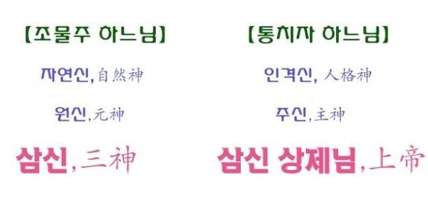 천지 만물과 인간이 생겨나는 생명 세계의 창조성과 신성을 한분의 신으로 말할 때는 우주의 본체신本體神, 즉 ‘우주의 조화정신 (순환원리), 우주 생명의 창조원리, 한 하느님 (순수 인격), 법신불法身佛’이 라고 부른다.