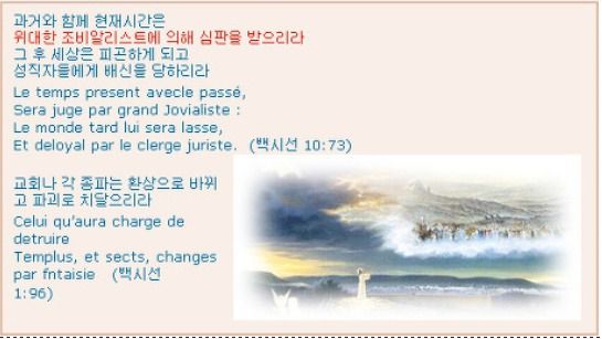 다음 시에서 프랑스 출신의 노스트라다무스는, 동방으로부터 자기 민족을 비롯한 구라파 사람들을 구원하러 오는 거룩한 무리들의 모습을 마치 영상을 보듯이 생생하게 그려주고 있다.