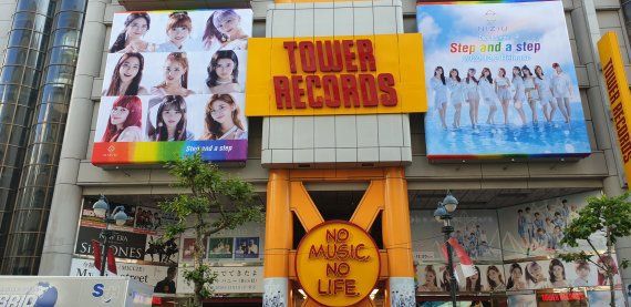 '젊음의 거리'로 불리는 도쿄 시부야의 대형 음반매장인 타워레코드에 일본 소니뮤직과 JYP가 손잡고 기획한 걸그룹 '니쥬'의 대형 사진이 지난 4일 전면에 걸려있다. 사진=조은효 특파원