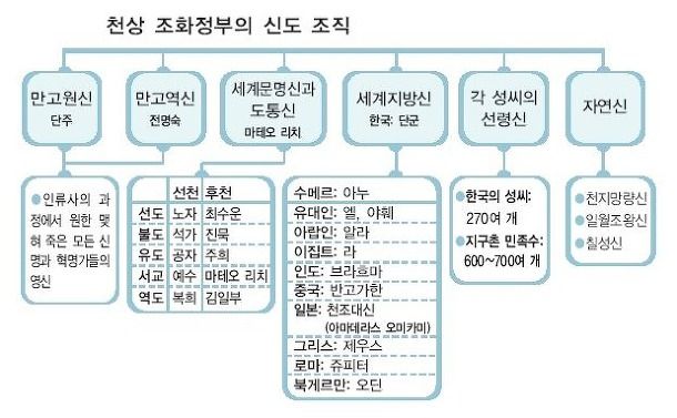 상제님이 그 신명들을 전부 끌어 모아서 신명세계를 조직하셨다. 그게 바로 신명정부다. 그 신명정부에서 세상 둥글어갈 틀을 짰으니, 다시 말하면 그것이 바로 조화정부(造化政府)다. 인간세상의 정부에도 무슨 농림부도 있고, 건설부도 있고, 상공부도 있고 각 부서가 있듯이, 신명정부를 조직해서 그 속에서 세상 둥글어갈 틀을 짜시었다.