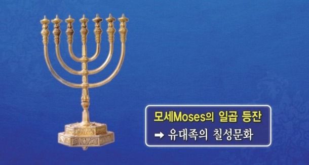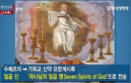 기독교의 창세신관을 보면 동방 환국에서 넘어간 칠성문화에 의해서 일곱 주신主神이 있습니다. 수메르 문명에서 그대로 가져간 것인데, 아브라함이 신앙문화를 전수해 주면서 이 일곱 주신 문화가 성립되었어요. 신약 계시록에 보면, 12사도 가운데 요한이 천상에 가서 하느님 아버지를 뵈었습니다. 하느님은 흰 보좌에 앉아 계셨습니다. 그리고 백보좌 하느님의 손을 보니까 일곱 별을 쥐고 계시고 그 앞에 일곱 촛대가 있었어요.