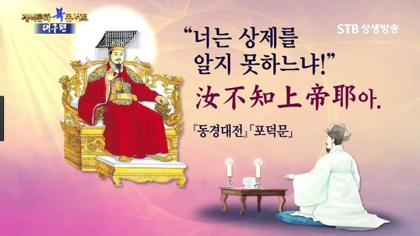 최수운 대신사는 “호천금궐 상제님을 너희 어찌 알까 보냐.”라고 하셨습니다. 우리는 역사 문화를 다 잃어버렸어요. 그래서 ‘어떻게 쉽게 저 호천금궐昊天金闕에서 우주를 통치하시는 천상의 하느님, 상제님을 알 수 있느냐? 나도 도통 받는 순간에 상제님께 경책警責을 받았다’는 것입니다. “네가 어찌 상제를 모르느냐? 네가 구도자로서 천지의 새 세상을 열망하는 기도자로서 어찌 상제를 모르느냐?”라고 말입니다.