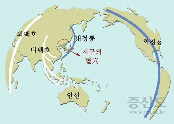 저 아메리카 대륙은 외청룡(外靑龍)이고, 아프리카 대륙은 외백호(外白虎)다.