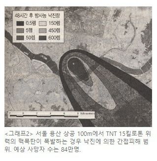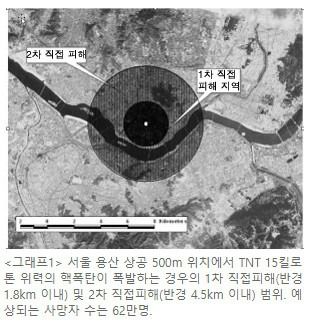 이를 서울 시내 지리에 적용해보면, 우선 직접 피격지역인 국방부와 합참은 물론 인근에 있는 용산 미군기지와 전쟁기념관 등의 시설은 글자 그대로 ‘녹아서 증발(evaporate)’해버린다. 주한미군사와 한미연합사를 비롯해 후암동에서 이촌동에 이르는 용산구 일대는 즉시 초토화된다. 폭발 당시 건물 안에 있는지 노천에 있는지, 건물의 종류가 무엇인지에 따라 피해의 심각성은 달라지지만 이 지역에 있는 사람은 사망할 가능성이 높다.