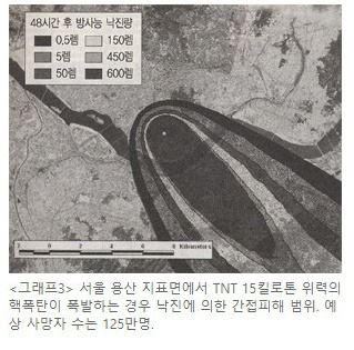 폭발이 지면 혹은 지면에서 가까운 상공에서 일어나는 경우에는 낙진에 의한 간접피해도 상당 규모의 인명피해를 낳는다. 용산구 삼각지의 100m 상공에서 15킬로톤 위력의 핵폭탄이 터졌을 경우를 가정해 낙진의 피해범위와 정도를 나타낸 것이 ‘그래프2’이고, 폭발이 지면에서 일어났을 때의 낙진 피해를 예측한 것이 ‘그래프3’이다. 이 경우 용산 일대에는 커다란 분화구 모양의 분지가 생기고, 그 자리에 있던 토사와 건물 파편은 고스란히 낙진이 된다.