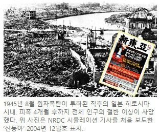 1945년 8월 원자폭탄이 투하된 직후의 일본 히로시마 시내. 피폭 4개월 후까지 전체 인구의 절반 이상이 사망했다. 위 사진은 NRDC 시뮬레이션 기사를 처음 보도한 ‘신동아’ 2004년 12월호 표지.