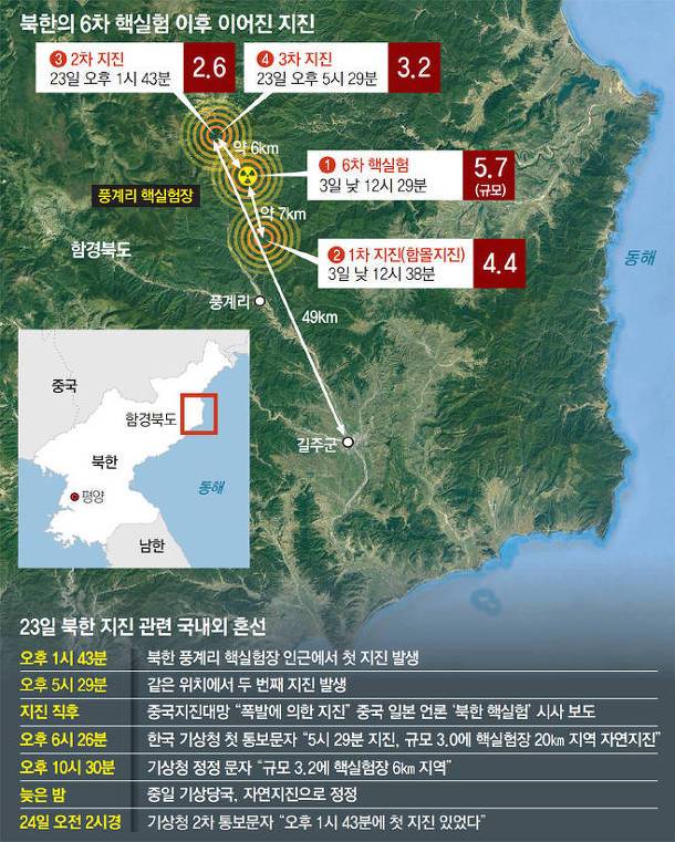기상청은 23일 오후 1시 43분과 5시 29분 북한 함경북도 길주군 풍계리 핵실험장에서 11시 방향으로 6km 떨어진 지점에서 각각 규모 2.6과 3.2의 지진이 관측됐다고 밝혔다. 3일 핵실험 직후 9분 뒤인 낮 12시 38분 규모 4.4의 ‘함몰지진’이 발생한 이후 20일 만에 자연지진이 생긴 것이다. 한때 진앙이 핵실험장 인근인 데다 진앙도 얕아 북한이 추가 핵실험을 한 것이 아니냐는 관측이 나오기도 했다.