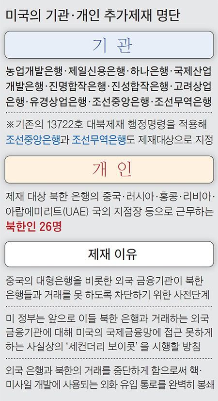 ① 중국 겨냥한 세컨더리 보이콧 예고탄=제재 대상에 오른 북한 은행과 거래한 모든 미국인과 미국 기관은 미 국내법에 따라 처벌을 받게 된다. 이번에는 북한만 타깃으로 했지만, 미국은 이들과 거래하는 다른 나라의 기관이나 개인도 추가로 제재한다는 방침이다. 제재 대상에 오른 북한 은행들은 사실상 국제 금융거래망에서 퇴출된 셈이다.