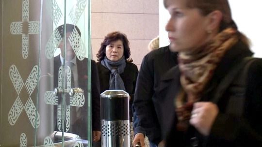 최선희 북한 외무성 북미국장 이 올레그 부르미스트로프 러시아 한반도 특임대사와 회담을 위해 26일 브누코보 공항에 도착하고 있다. [모스크바=연합뉴스]