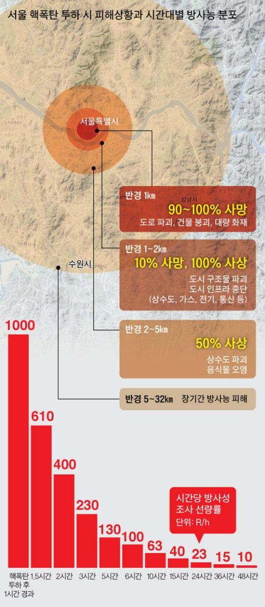 유사시 북한이 서울 도심을 향해 핵미사일을 발사할 경우 최대 300만 명의 인명피해가 발생할 수 있는 것으로 나타났다. 그러나 핵폭발 후 48시간 안에 대응을 잘한다면 인명피해를 5만 명 수준으로 낮출 수 있다고 한다.