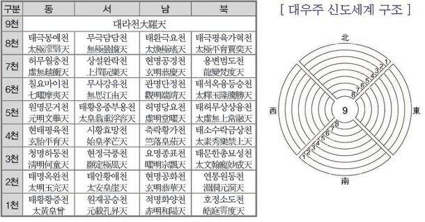 9천으로 벌어진 신명 세계는 저층으로 내려갈수록 의식 수준이 더 낮고 이기적이며 자기중심적인 신명들이 모여 삽니다. 반대로 상층으로 올라갈수록 영적인 경계가 우주적 차원으로 더욱 확대되어 천지와 더불어 함께하는 성신聖神들이 살고 있습니다.
