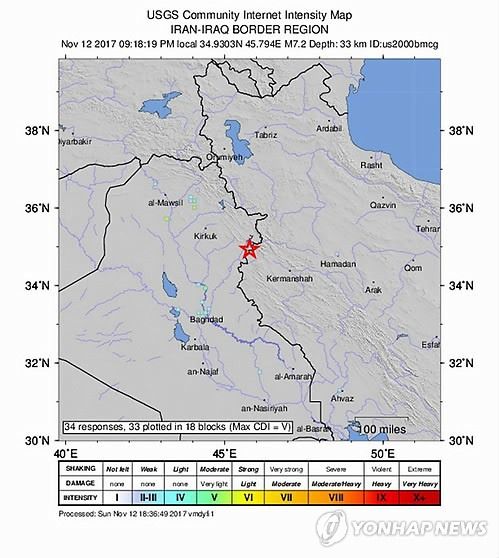 (서울=연합뉴스) 노재현 기자 = 이란 북서부 케르만샤 주와 이라크 북동부 쿠르드자치지역 술라이마니야주(州)의 국경지대에서 12일 오후 발생한 규모 7.3 강진으로 숨진 이들의 수가 100명을 넘어섰다.