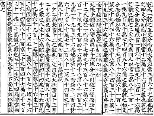 ■ 건乾은 1 로 건괘의 5 효爻가 나누어져 대유괘大有卦가 되는데 360 수數와 같고 건괘乾卦의 4 효爻가 나누어져 소축괘小畜卦가 되는데 129,600 의 수數와 같으며, 건괘乾卦의 3 효爻가 나누어져 이괘履卦가 되는데 167 억 961 만의 수數와 같고 건괘乾卦의 2 효爻가 나누어져 동인괘同人卦가 되는데 28,211 조 990 만 7,456 억의 수數와 같으며, 건괘乾卦의 초효初爻가 나누어져 구괘?卦가 되는데 7자 9,586 만 6,110 해垓 9,946 만 4,008 경京 8,439 만 1,936 조兆 의 수數와 같다. 이것을 분수分數라고 하는데 큰 것을 나누어 작게 하는 것이다. 모두 위로부터 아래로 내려가므로 양수陽數이다. ■ 하늘은 체體를 총괄하므로 8 변變하여 16 에서 그치고 땅은 용用을 나누어 맡으므로 6 변變하여 12 에서 그친다. 하늘은 1 에서 시작하여 7 자 9,586 만 6,110 해垓 9,946 만 4,008 경京 8,439 만 1,936 조兆 에서 그치고 땅은 12 에서 시작하여 204 자 6,980 만 7,381 해垓 5,491 만 8,499 조兆 720 만 억億 에서 그친다. ■ 1 은 2 를 낳는데 쾌괘?卦가 되며 12 의 수數와 같다. 2 는 4 를 낳는데 대장괘大壯卦가 되며 4,320 의 수數와 같다. 4 는 8 을 낳는데 태괘泰卦가 되며 5 억 5,987 만 6,915 억 2,000 만의 수數와 같다. 8 은 16 을 낳는데 임괘臨卦가 되며 944 조 3,699 만 6,915 억 2,000 만의 수數와 같다. 16 은 32 를 낳는데 복괘復卦가 되며 2,652 만 8,870 해垓 3,664 만 8,800 경京 2,947 만 9,731 조兆 2,000 만 억億의 수數와 같다. 32 는 64 를 낳는데 곤괘坤卦가 되며 무극無極의 수數와 같다. 이것을 장수長數라고 하는데 작은 것이 자라서 커지는 것이다. 모두 아래로부터 위로 올라가므로 음수陰數이다.