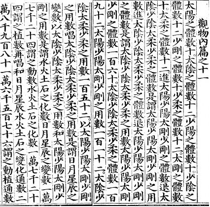 일월성신日月星辰의 변수變數는 17,024 인데 이것을 동물의 수數라고 하며, 수화토석水火土石의 화수化數는 17,024 인데 이것을 식물의 수數라고 한다. 다시 창화唱和하면 일월성신日月星辰 · 수화토석水火土石의 변화의 통수通數는 28,981만 6,576 인데 이것을 동식물의 통수通數라고 한다.