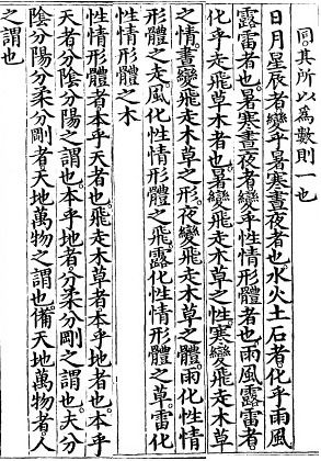 ■ 성정형체性情形體는 하늘에 근본을 두고 있으며 비주초목飛走草木은 땅에 근본을 두고 있다. 하늘에 근본을 둔 것은 음陰과 양陽으로 나누어지는 것을 말하며 땅에 근본을 둔 것은 유柔와 강剛으로 나누어지는 것을 말한다. 무릇 음陰 · 양陽 · 강剛 · 유柔 로 나누어지는 것을 천지만물이라 일컫고 천지만물을 갖추고 있는 것을 사람이라고 일컫는다.