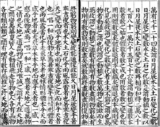 일日 · 월月 · 성星 · 신辰은 서暑 · 한寒 · 주晝 · 야夜로 변하고, 수水 · 화火 · 토土 · 석石은 우雨 · 풍風 · 로露 · 뢰雷로 변하게 된다. 서暑 · 한寒 · 주晝 · 야夜는 하늘의 변화가 땅을 불러서 된 것이고, 우雨 · 풍風 · 로露 · 뢰雷는 땅의 변함이 하늘에 화답하여 된 것이다. 이 한 번 창唱하고 한 번 화和하는 연후에야 물物이 생하는 것이다. 서暑 · 한寒 · 주晝 · 야夜는 성性 · 정情 · 형形 · 체體로 변하고, 우雨 · 풍風 · 로露 · 뢰雷는 주走 · 비飛 · 초草 · 목木으로 변한다. 성性 · 정情 · 형形 · 체體는 하늘에 근원을 두고 땅에 감응된 것이며, 주走 · 비飛 · 초草 · 목木은 땅에 근본하고 하늘에 응험된 것이다. 한 번 감感하고 한 번 응應한 후에 만물이 이루어지게 된다. 즉 창唱 · 화和 · 감感 · 응應은 천지의 도道이며 만물의 정情인 것이다. 천지의 도道와 만물의 정情은 오로지 그 정성스러움을 이르는 것이다. 무릇 천지 사이에는 중국 사람이나 그 밖의 야만인이나 모두 사람이며, 주走 · 비飛 · 초草 · 목木는 모두 물체이다. 사람은 각각 성품이 있고 만물은 각각 종류가 있다. 성품과 종류 사이에는 이理와 수數가 있다.