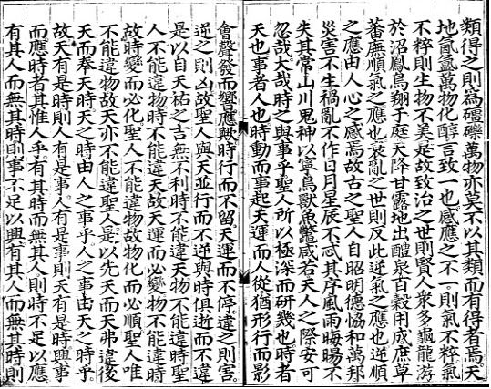 천지의 기운이 인온氤氳하고 만물이 화순化醇하는 것을 일러 하나를 이루었다고 한다. 그 감응하는 것이 하나를 이루지 못하는 것은 기氣가 순수하지 못함이고, 순수하지 못하면 생물이 불미不美하게 된다. 그러므로 그 치세治世에 이르게 되면 현인賢人의 무리가 많아지고 거북이가 연못에 뜨며 봉황이 뜰에 내리고 하늘에서 감로甘露가 내리며 땅에서 예천醴泉이 솟아 나온다. 온갖 곡식이 쓰임을 이루게 되고 뭇 풀들이 무성하게 되니 순기順氣에 응한 것이다. 쇠약하여 난세亂世가 되면 반대로 역기逆氣에 응하게 되는데 이 역逆과 순順의 응험되는 것을 인심人心이 감응함에 말미암는다. 그러므로 옛적의 성인은 스스로 밝은 덕을 밝히어 여러 이웃 나라와 사이 좋게 지냈으며, 재해가 생기지 아니하고 화란禍亂이 일어나지 않았으며, 일월성신日月星辰이 그 순서를 어기지 않았고 바람 · 비 · 밝음 · 어둠이 그 일정한 법칙을 잃지 않았으며, 산천의 귀신이 날짐승 · 들짐승 · 물고기 · 자라 등을 다 같이 편안히 하고 함께했다. 하늘과 사람 사이에 어찌 문득 이렇게 되리요. 크도다. 시時와 더불어 사事가 됨이여. 성인이 매우 깊이 있게 연구한 까닭이리라!