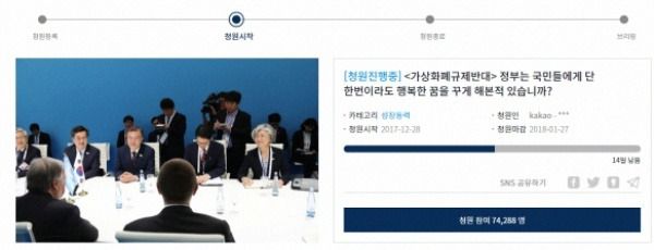 ‘<가상화폐규제반대> 정부는 국민들에게 단 한번이라도 행복한 꿈을 꾸게 해본적 있습니까?’라는 청원은 현재 입소문을 타면서 빠른 속도로 서명 인원을 늘리는 중이다. 20만명 이상의 서명을 받을 경우 정부의 책임있는 관련 부처 관계자에게 직접 답변을 받을 수 있다.