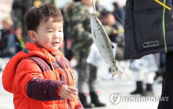 (화천=연합뉴스) 양지웅 기자 = 17일 강원도 화천군 화천천에서 열린 '2018 화천산천어축제'에서 한 어린이가 낚아올린 산천어를 반기고 있다. 축제는 오는 28일까지 펼쳐진다. 2018.1.17 yangdoo@yna.co.kr